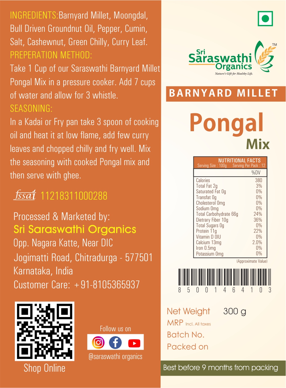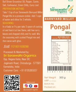 Preperation Method: Take 1 Cup of our Barnyard Millet Pongal Mix in a pressure cooker. Add 6 cups of water and allow for 3 whistle.