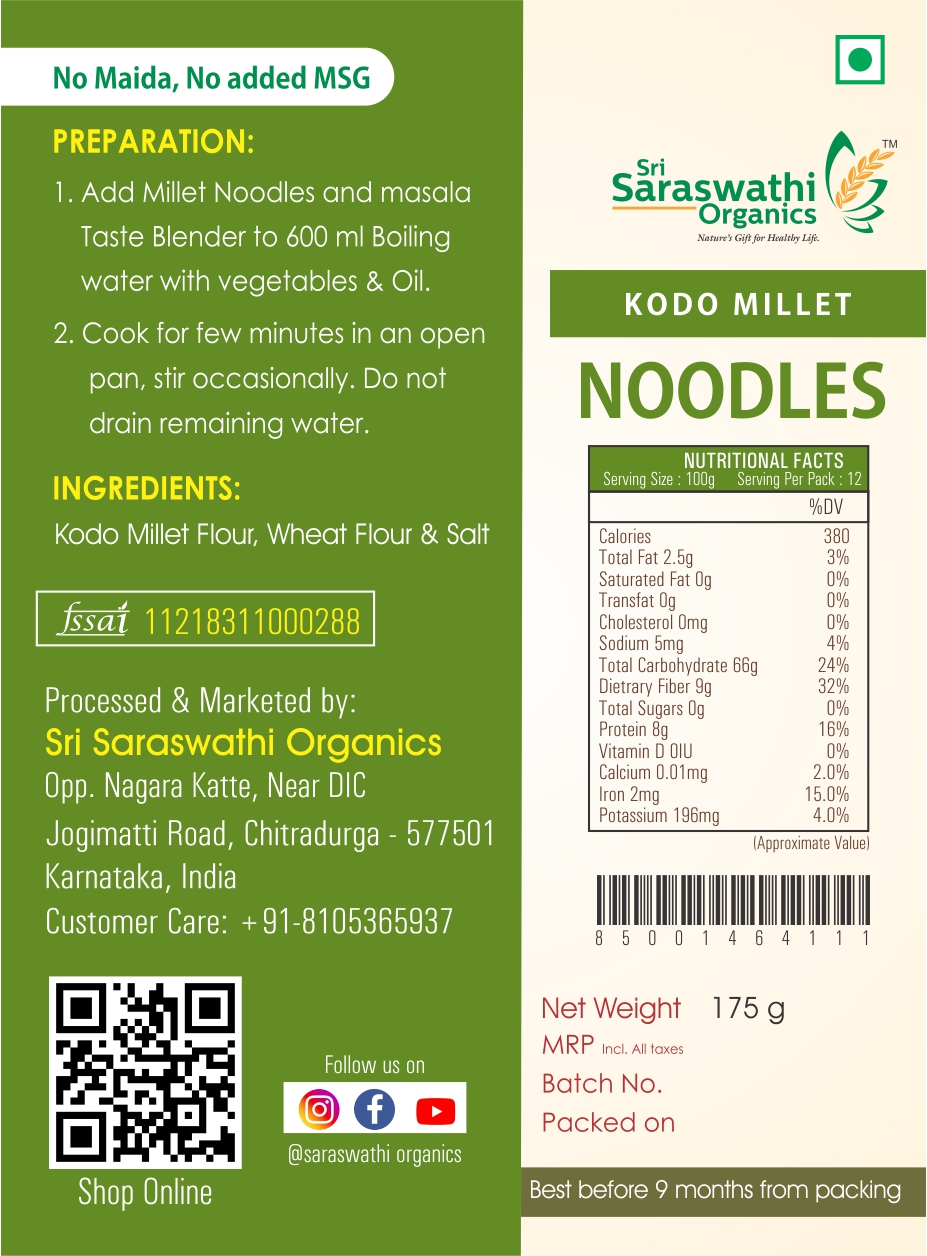 - Kodo Millet Noodles are made out of 80% Kodo Millet and 20% Samba wheat. Wheat is being added to give the binding and texture for noodles.