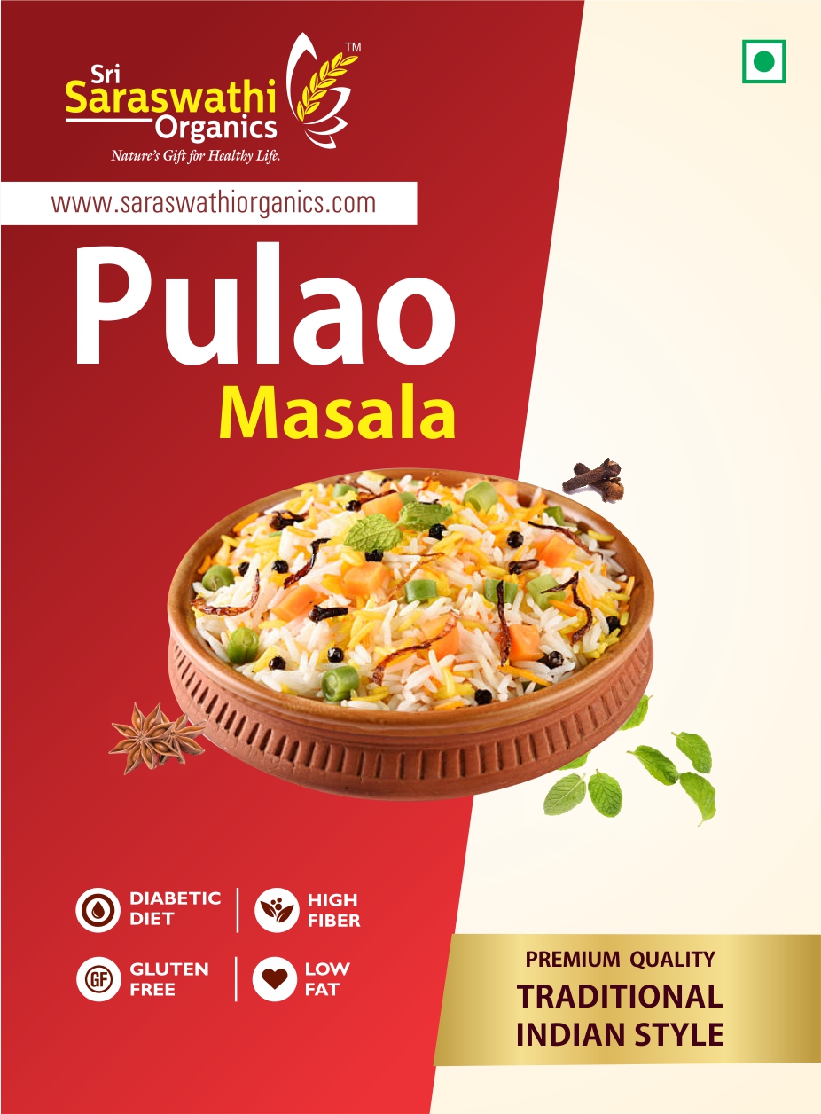 “Sri Saraswathi Organics” Pulao masala can be added in a measured quantity to Pulav, Veg Biryani. to have that extra dash of spice that marks out the uniqueness of Indian dishes.