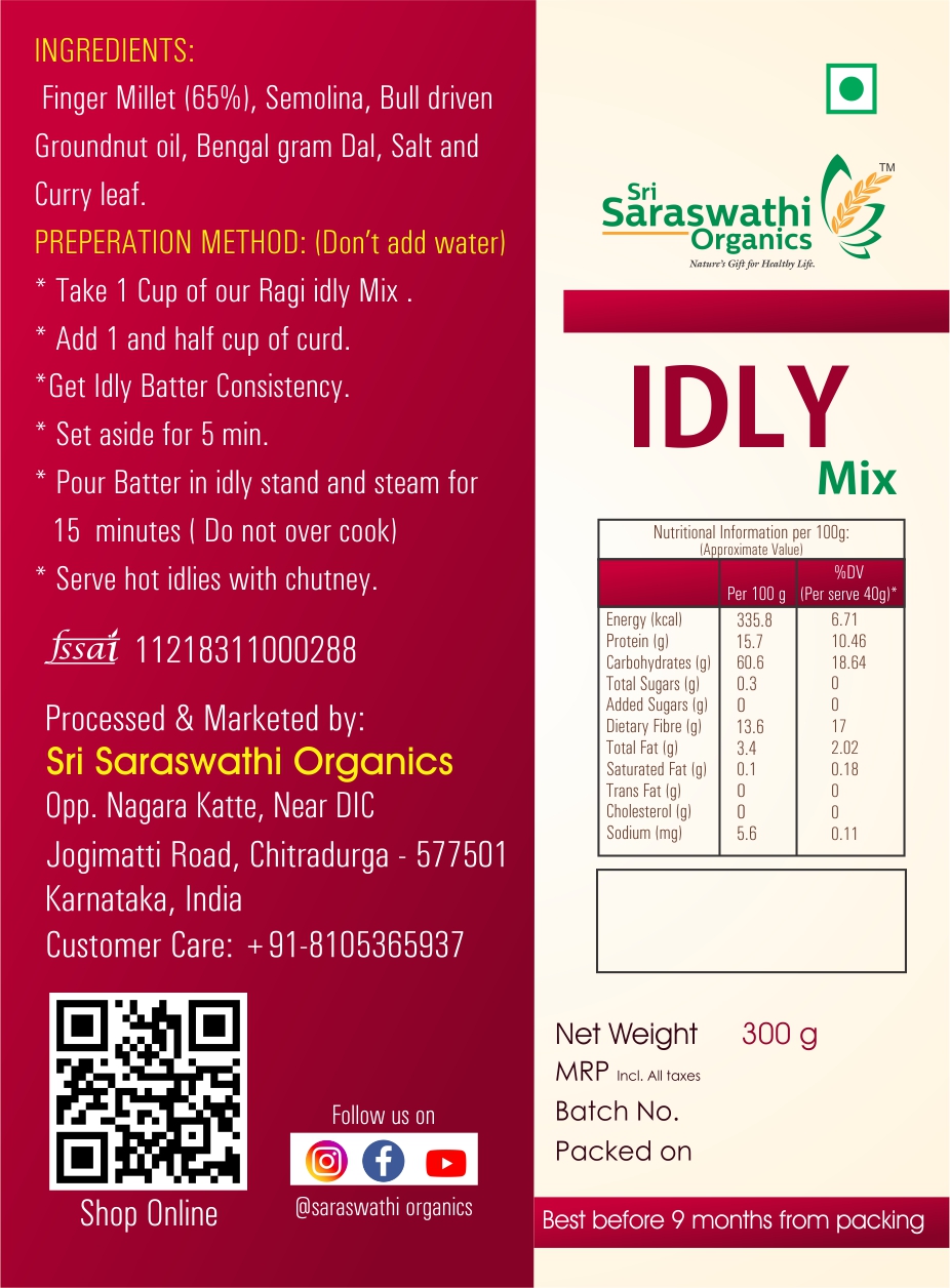 Ingredients: Finger Millet (65%), Semolina, Bull driven Groundnut oil, Bengal gram Dal, Salt and Curry leaf.